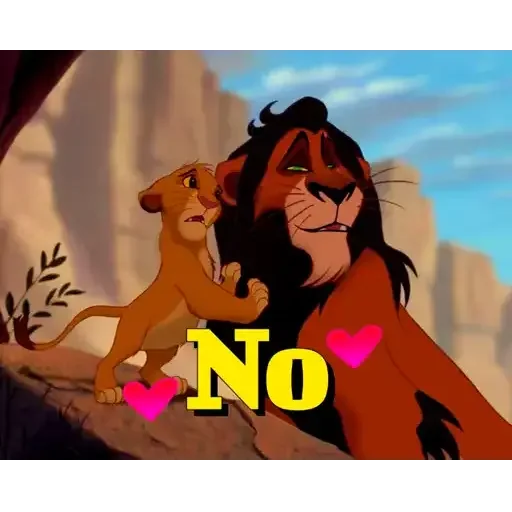Um leão adulto e um filhote de leão com a palavra 'Não' em amarelo e corações rosa. O cenário é de savana com rochas e céu azul.
