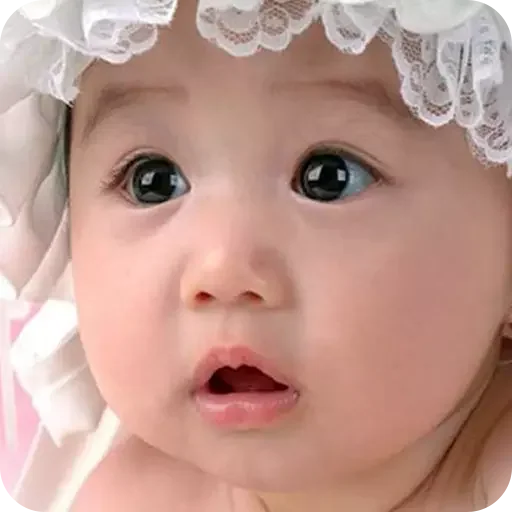 Rosto de bebê surpreso com boca aberta e chapéu branco.