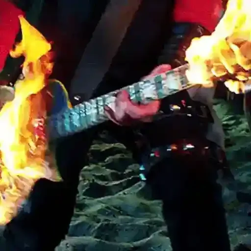 Uma pessoa segura um violão em chamas, com as mãos e pernas visíveis. A pessoa veste roupas escuras e tem as mãos queimando com fogo.