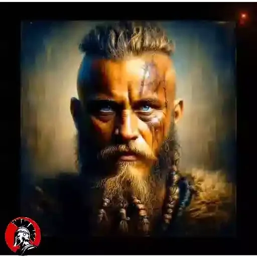 Rosto de um homem com cabelo curto e barba longa, olhos claros e expressão séria. Ele está usando colares e tem marcas no rosto.