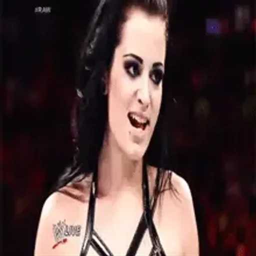 Mulher com cabelo preto e maquiagem pesada em um evento lotado, possivelmente um ringue de luta livre, com o texto…