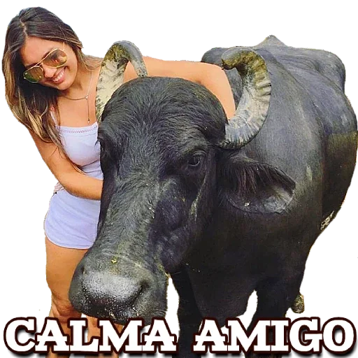 Uma mulher de biquíni abraçando um touro preto com chifres, com o texto 'CALMA AMIGO' na parte inferior.