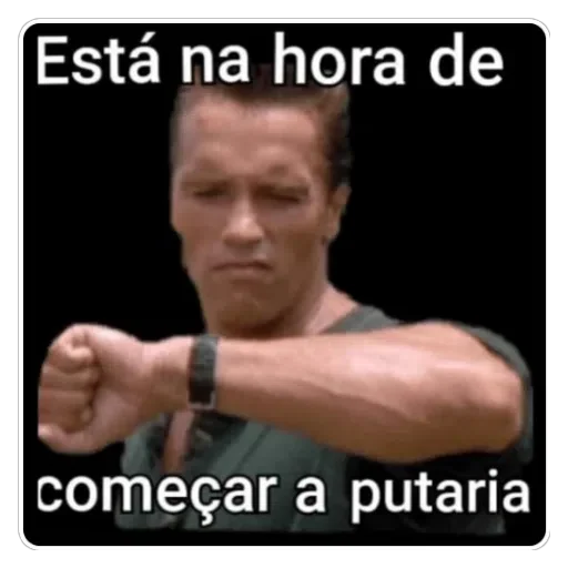 Um homem com expressão séria olha para o pulso, com o texto 'Está na hora de começar a putaria' sobreposto.