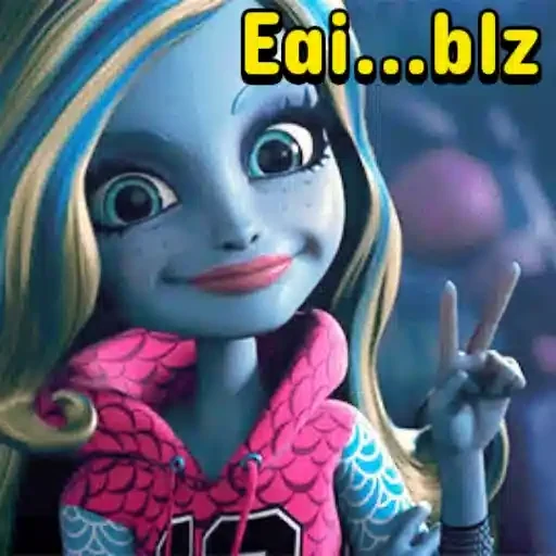 Uma garota de cabelo loiro com faixas azuis sorri e faz um gesto com a mão, com o texto 'Eai...blz' em amarelo no topo. Ela veste uma jaqueta rosa com padrões de peixe.