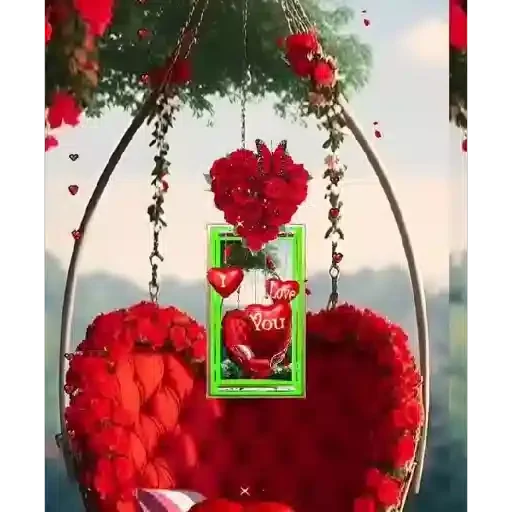 Um coração vermelho gigante em uma cadeira suspensa, decorado com rosas vermelhas e folhas, com um quadro verde destacando um coração de Natal vermelho com o texto 'Merry Xmas' em branco.