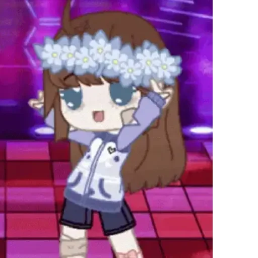 Uma menina de anime com cabelos castanhos e olhos azuis, usando uma coroa de flores brancas, um casaco branco com manchas e shorts pretos. Ela está com a boca aberta e a mão levantada.