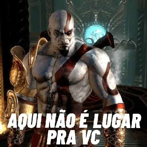 Personagem de God of War com expressão séria e braço levantado, fundo escuro com luz azul. Texto: 'AQUI NÃO É LUGAR PRA VC'