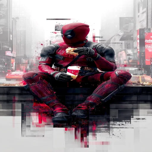Deadpool sentado em um parapeito, comendo pizza em uma cidade. Ele está usando seu traje vermelho e preto.