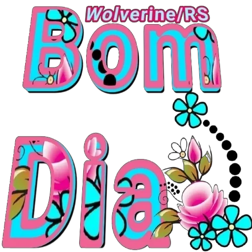 Um sticker colorido com a frase 'Bom Dia' em letras grandes e decoradas, com flores e folhas. Acima da frase, há o texto 'Wolverine/RS' em rosa.