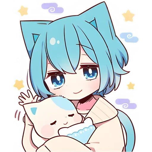 Uma menina de cabelo azul com orelhas de gato abraçando um gato branco com marca azul na testa, ambos com expressões fofas. Estrelas, nuvens e carros coloridos ao fundo.