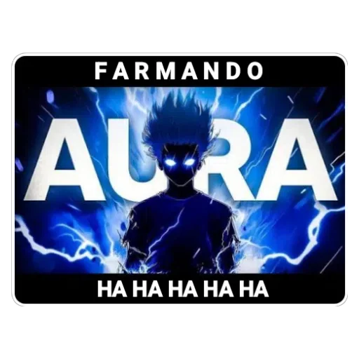Um personagem de anime com olhos brilhantes e cabelo espetado, em um fundo azul com raios. A palavra 'AURA' está escrita em letras grandes atrás dele, com 'FARMANDO' em cima e 'HA HA HA HA HA' em baixo.