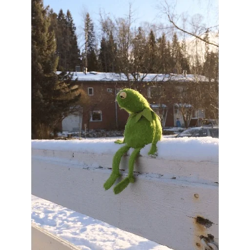 Um ursinho de pelúcia verde sentado na neve, com uma casa e árvores ao fundo.