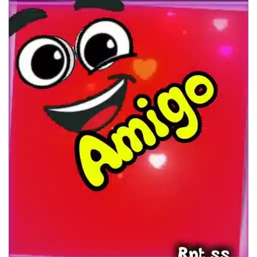 Um rosto de um personagem de desenho animado vermelho com olhos grandes e um sorriso, escrito 'Amigo' em amarelo. Corações ao fundo.