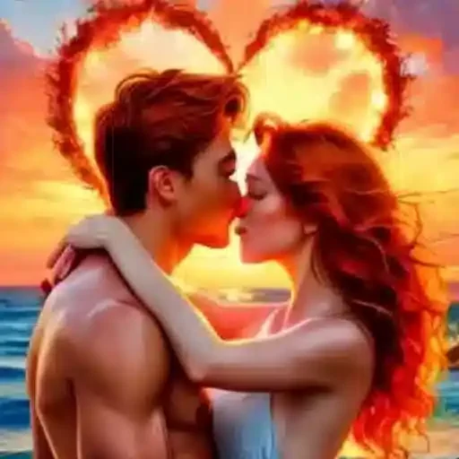 Um casal se beijando ao pôr do sol na praia, com um coração flamejante ao fundo.