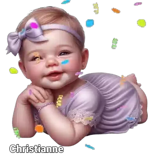 Menina bebê deitada de bruços com faixa na cabeça e confetes coloridos ao redor. Ela parece sorrir e tem gotas de suor ou lágrimas coloridas no rosto.