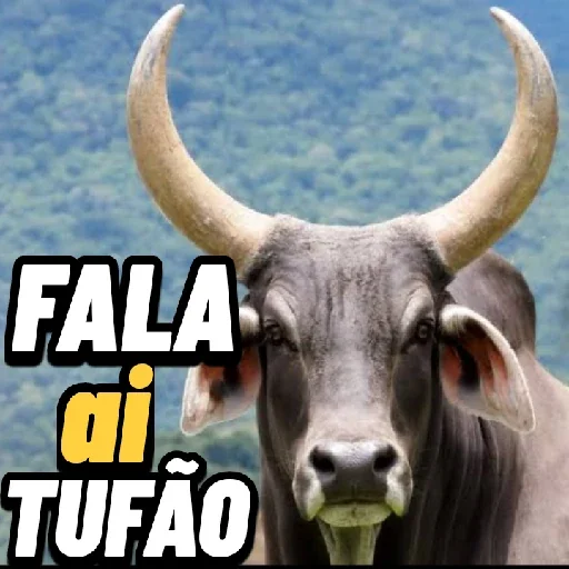 Um boi com chifres grandes e expressão séria, com o texto 'FALA ai TUFÃO' em letras grandes e coloridas.