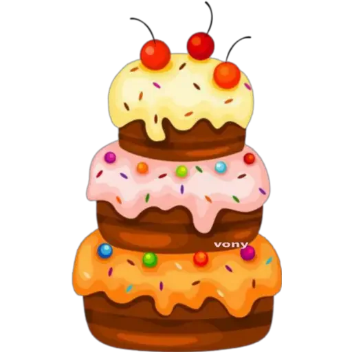 Um bolo de três andares com glacê colorido e confeitos. O bolo tem cobertura laranja, rosa e amarela com confeitos e cerejas no topo.