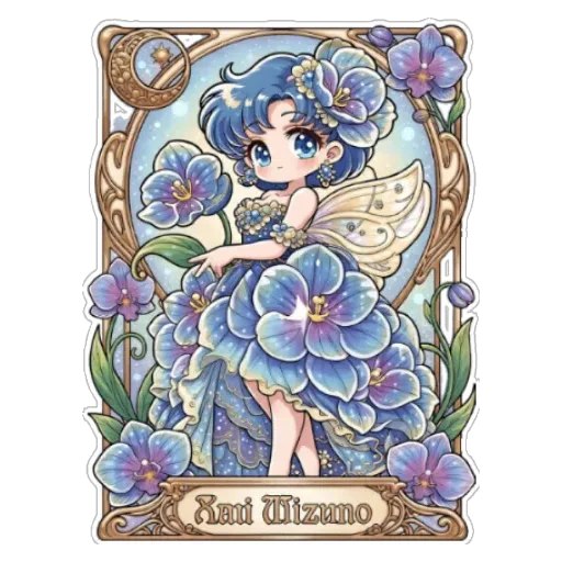 Uma fada com cabelo azul e vestido feito de flores azuis, segurando uma flor, emoldurada por uma borda dourada com flores roxas e azuis. Abaixo da fada, há um texto que diz 'Ani Welcome'.
