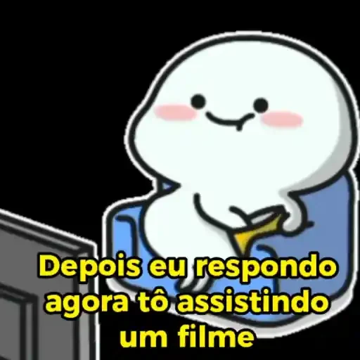 Um personagem de desenho animado, um ser branco com semblante feliz e bochechas rosadas, está sentado assistindo a um filme. Abaixo dele, está escrito 'Depois eu respondo agora tô assistindo um filme'.