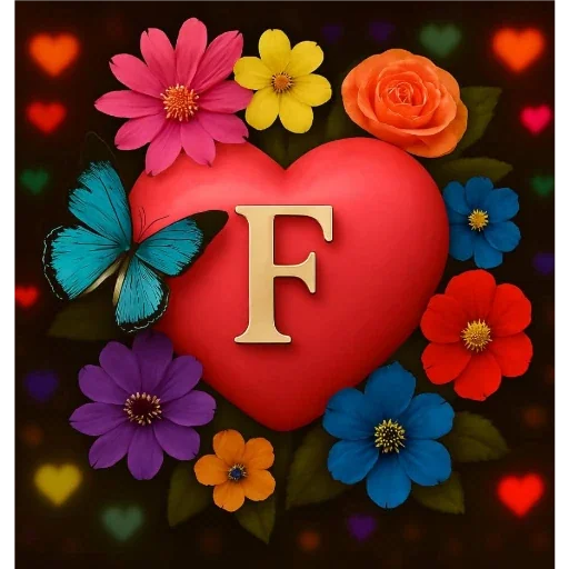 Um coração vermelho decorado com flores coloridas e borboletas, com a letra 'F' no centro. Fundo escuro com corações e flores.