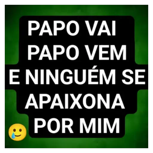 Um quadrado preto com texto branco que diz 'PAPO VAI PAPO VEM E NINGUÉM SE APAIXONA POR MIM'. Abaixo do texto, um emoji amarelo com lágrima de alegria. O fundo é verde escuro.
