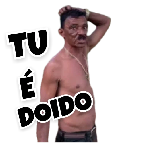 Um homem sem camisa com a mão no cabelo e expressão de surpresa, com o texto "TU É DOIDO" sobreposto.