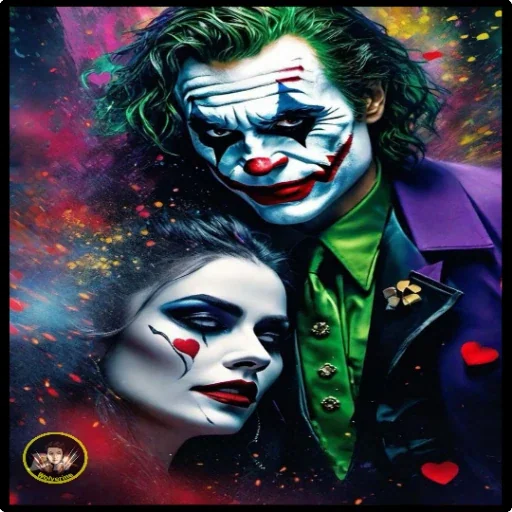 O Coringa e Arlequina com maquiagem colorida e um fundo multicolorido com efeito de respingos.