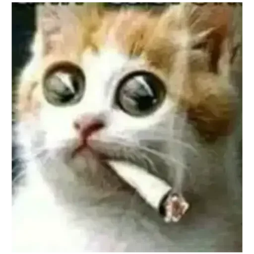 Gatinho com olhos arregalados e um cigarro na boca, parecendo surpreso ou assustado. A imagem é desfocada e tem aspecto de meme.
