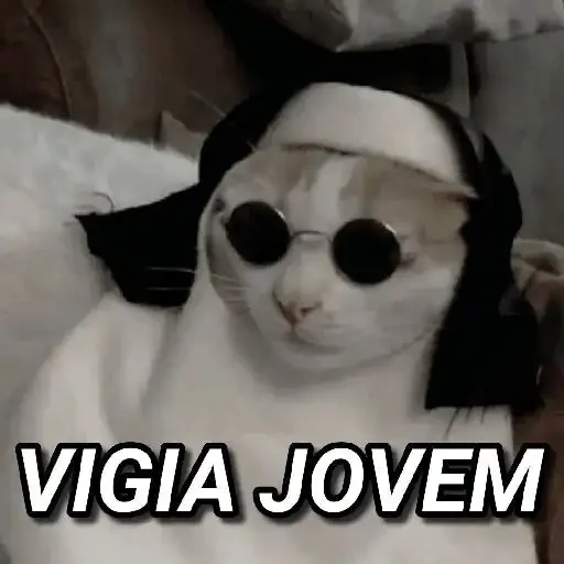 Gato com máscara facial e óculos de sol, parecendo uma freira, com o texto 'VIGIA JOVEM' na parte inferior.