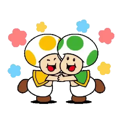 Dois personagens de Mario, com cogumelos coloridos na cabeça, se abraçando e sorrindo, com flores coloridas ao redor.