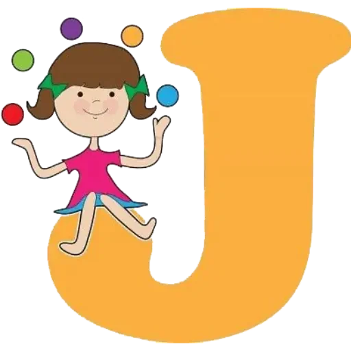 Menina de cabelos castanhos e fitas verdes, vestindo uma roupa rosa e azul, sentada em uma letra 'J' amarela, com bolinhas coloridas ao redor.