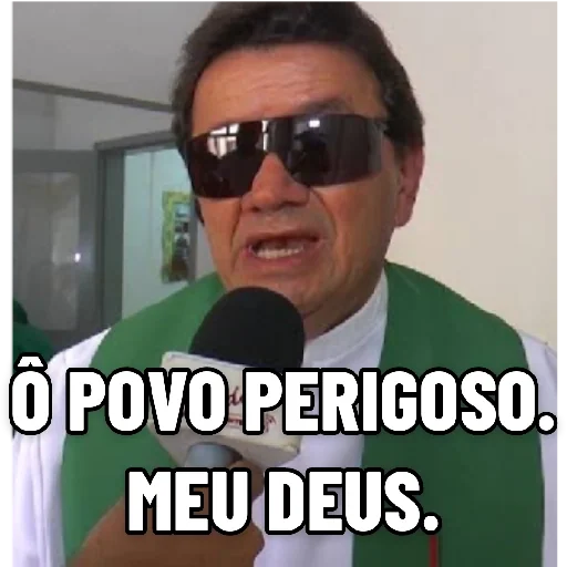 Um homem de meia-idade com óculos escuros e uma estola verde falando em um microfone. Ele está com uma expressão de espanto e diz "Ô povo perigoso. Meu Deus."