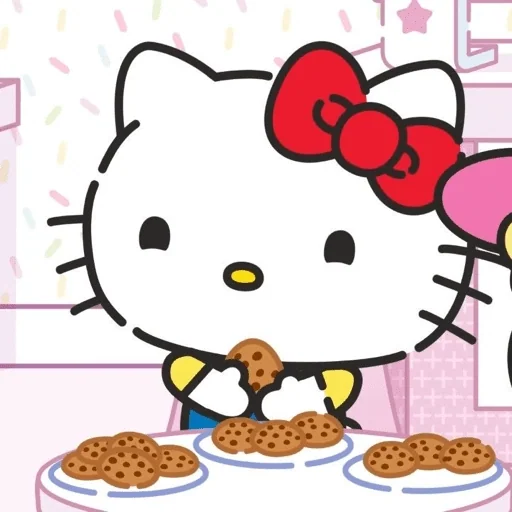 Rosto de Hello Kitty com um laço rosa, fazendo um gesto com a mão e com dois triângulos rosas atrás da cabeça.