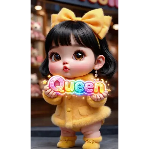 Menina fofa com um laço amarelo no cabelo e um casaco amarelo segurando um sinal com a palavra 'Queen' colorida.