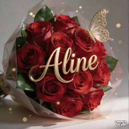 Um buquê de rosas vermelhas com o nome 'Aline' em letras douradas no centro. O buquê é envolvido em papel transparente e decorado com uma borboleta dourada e pontos dourados.