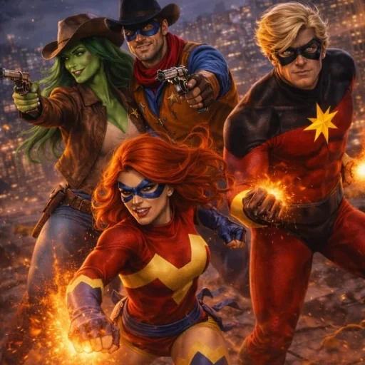 Quatro super-heróis em pose de ação, com uma mulher ruiva no centro vestindo um traje vermelho e amarelo, acompanhada de um homem de cabelos loiros, um homem de chapéu e um personagem verde com cabelo comprido.