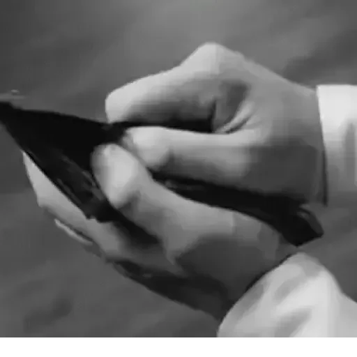 Mão segurando um celular em preto e branco.