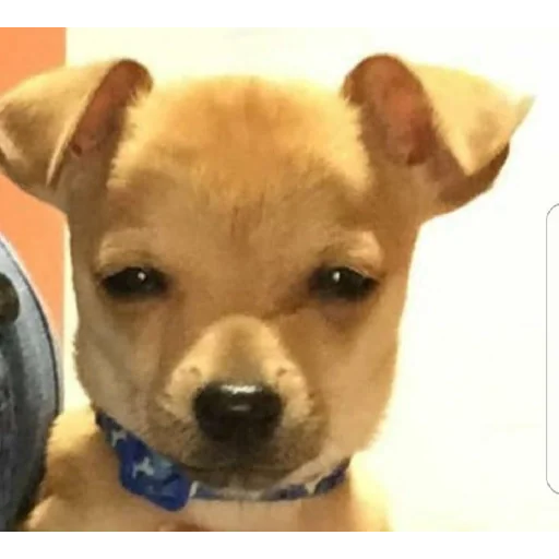Um filhote de cachorro com focinho preto e colar azul, olhando para frente com expressão séria.