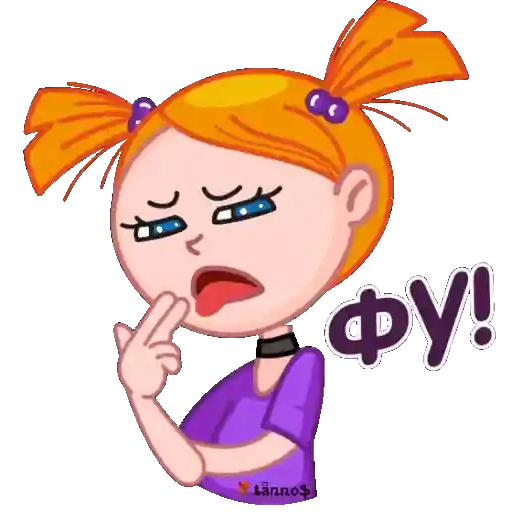 Menina de cabelos laranjas em dois coques, com expressão de desaprovação ou surpresa, fazendo um gesto com o dedo indicador na boca e a inscrição 'ФУ!' ao lado.