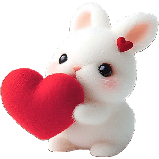 Um coelho branco fofinho com um coração vermelho na frente do rosto e outro coração vermelho no lado direito da cabeça.