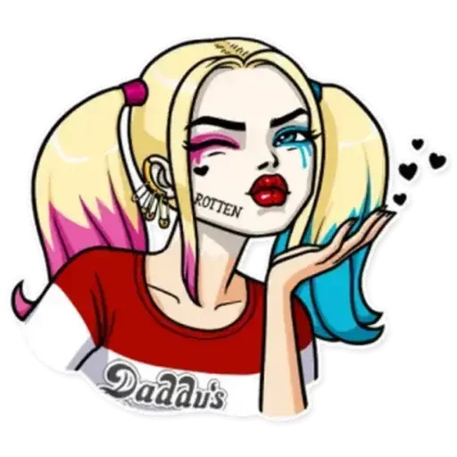 Personagem de desenho animado da Arlequina com cabelo loiro, rosa e azul, maquiagem colorida e um sorriso malicioso.…