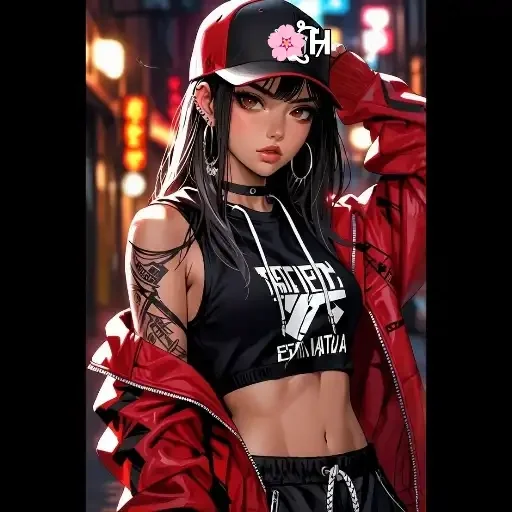 Uma mulher jovem com cabelos pretos longos e uma jaqueta vermelha está em frente a luzes de fundo coloridas. Ela usa um boné preto com uma flor rosa, um cropped preto com texto branco e calças pretas.