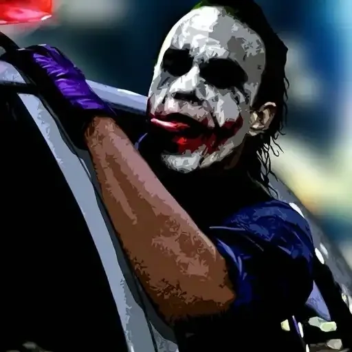 O Coringa, interpretado por Heath Ledger, com maquiagem branca no rosto, olhos escuros e sorriso vermelho.