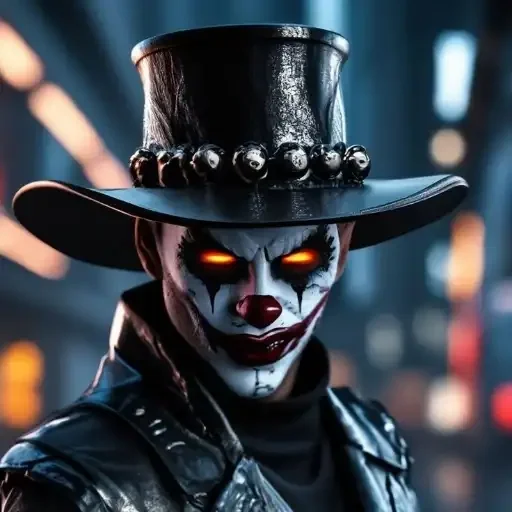 Um personagem com rosto pintado de branco e olhos laranja brilhantes, usando um chapéu preto alto e uma roupa escura.