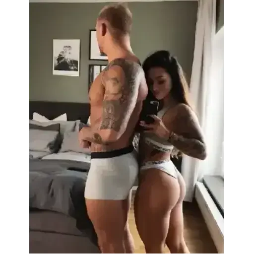 Um casal nu, com o homem de costas e a mulher ao lado, ambos de calcinha, em um quarto com cama e cortinas.
