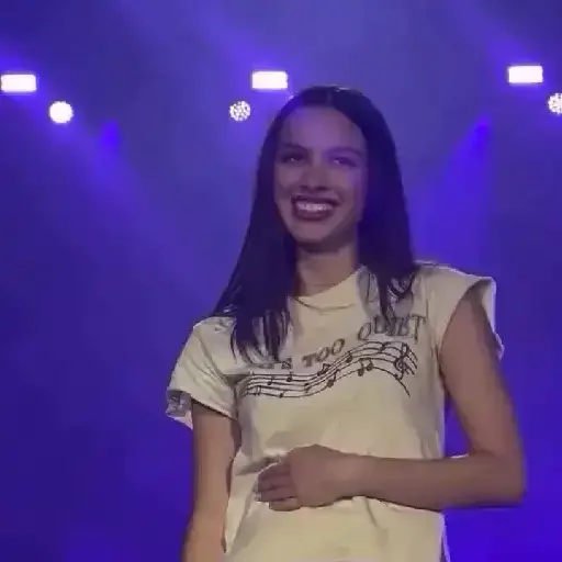 Uma jovem mulher com cabelo preto e um sorriso largo, vestindo uma camiseta branca com detalhes em preto, em um palco com luzes azuis.