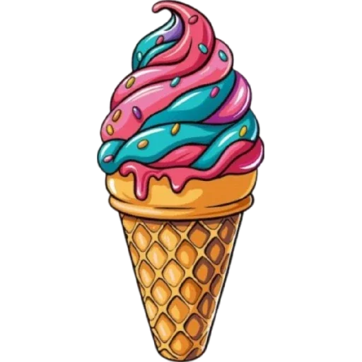 Um sorvete de casquinha com duas cores, rosa e azul, decorado com confeitos.