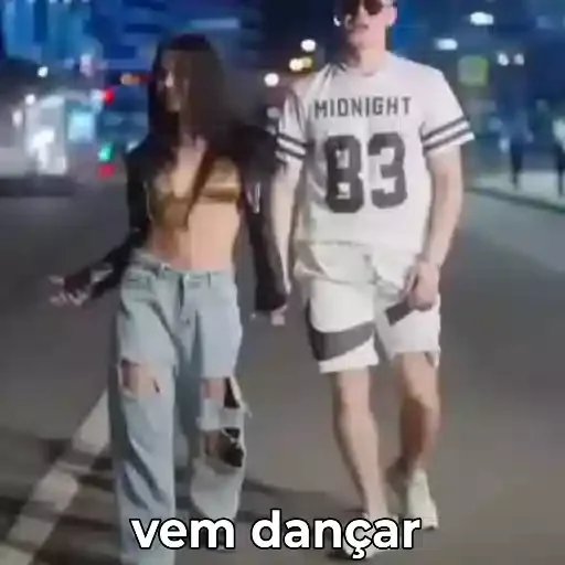Um casal caminhando à noite, com o homem vestindo uma camisa branca com o número 93 e a mulher com uma blusa preta e calça jeans rasgada. O texto 'vem dançar' aparece na parte inferior.