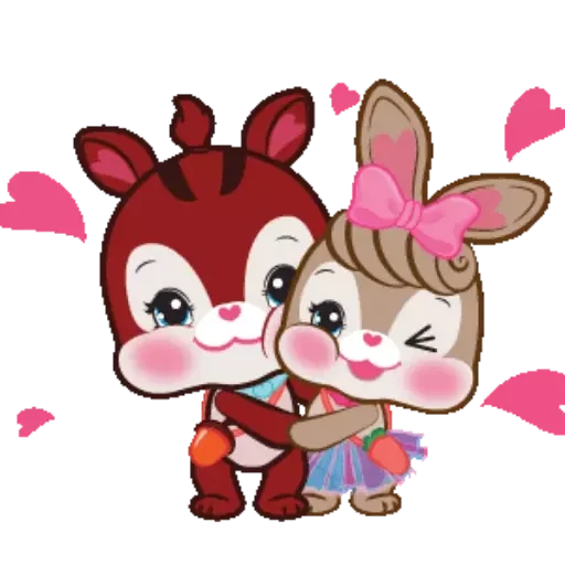 Dois coelhos fofos se abraçando, um vermelho e um marrom com laço rosa, rodeados de corações rosa.