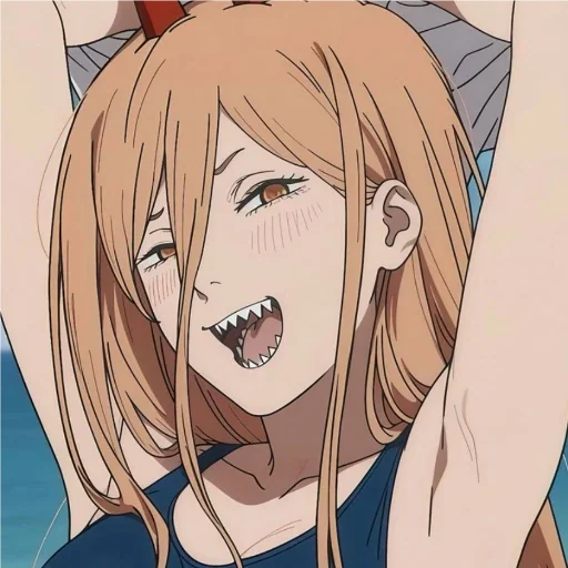Garota de anime com cabelo castanho e olhos verdes, vestindo uma blusa azul, com uma expressão de surpresa ou choque, mostrando os dentes.
